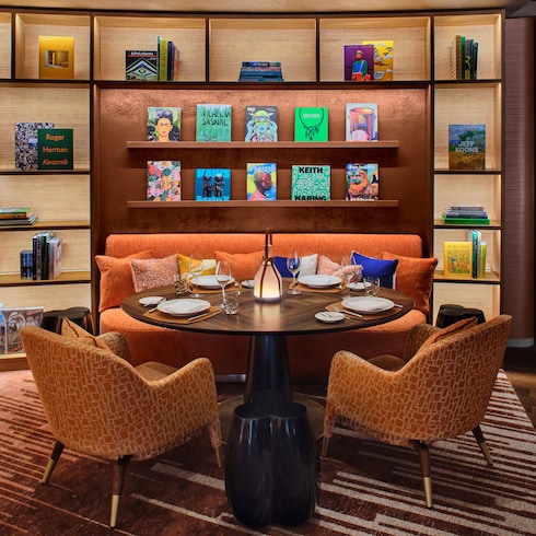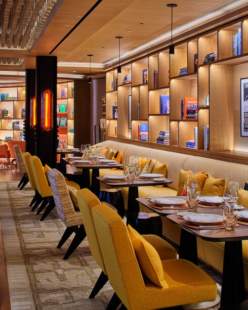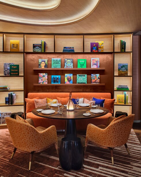 Le Café Louis Vuitton on the fourth floor is the House's first library café in the US, a cultural meeting place where visitors can enjoy curated books and an innovative take on luxury snacking. Celebrating a new culinary community, the café with chefs Christophe Bellanca and Mary George fosters local talent under the mentorship of French chefs Arnaud Donckele and Maxime Frédéric.