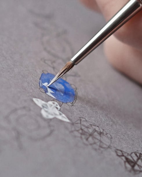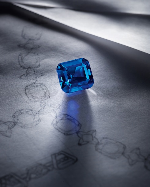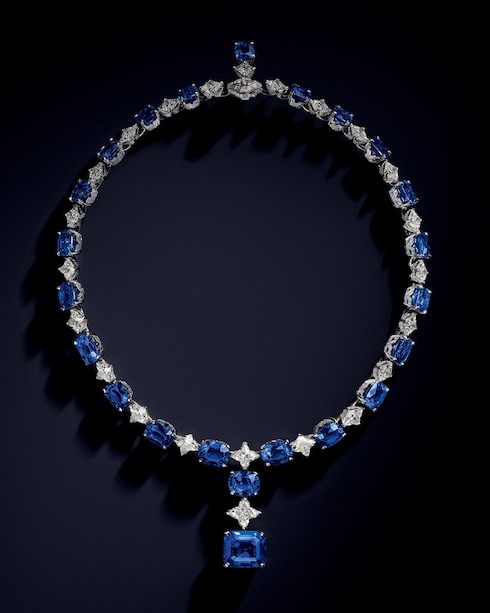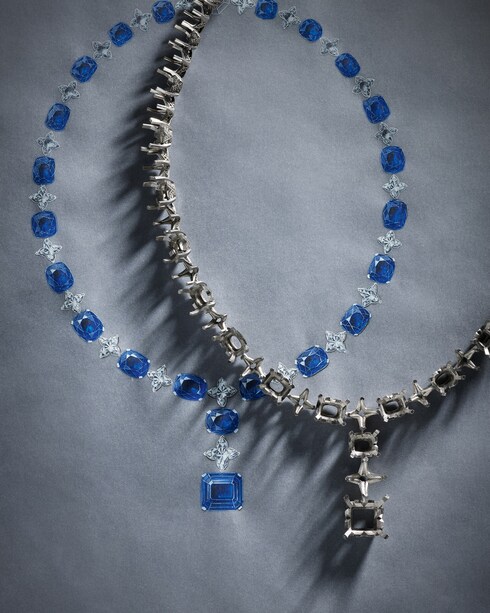 Exuding a deep royal blue hue, the Louis Vuitton Aster necklace showcases a constellation of the world’s most prestigious stones — rare and legendary Kashmir sapphires. Comprised of 23 stones weighing over 125 carats, the creation reveals a natural and untreated 17.88-carat sapphire at its center, emanating light with a star-like quality. Perfectly matched in color, shape, and crystal transparency, the remarkable gemstones were sourced with a discerning eye and unwavering determination, elegantly assembled to form an extraordinary regal design.