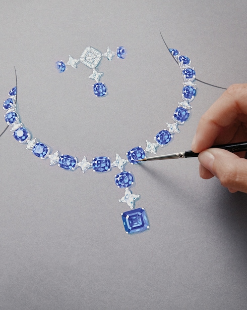 Merging the singular beauty of the gemstones with the exacting precision of the Maison’s High Jewelry savoir-faire, the Louis Vuitton Aster necklace honors the rare sapphires and exceptional diamonds in refined symmetry — nearing perfection. In a radiant symphony of iridescence, the graduating sizes of the sapphires alternate with the iconic custom LV Monogram Star cut diamonds in a fully articulated design, flexible as silk. Mirroring the velvet hues of the night sky, the piece evokes Francesca Amfitheatrof’s celestial inspirations.