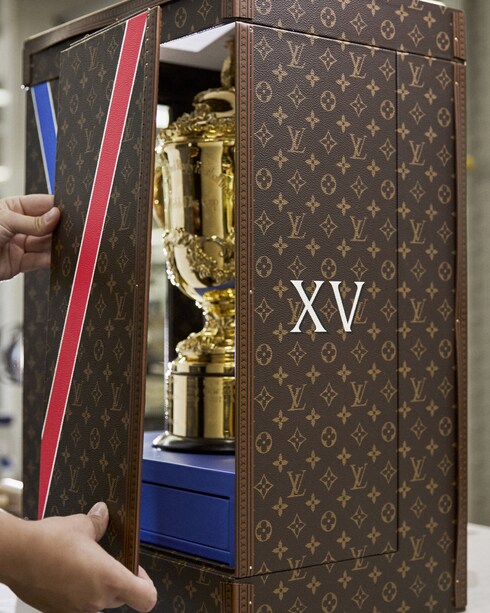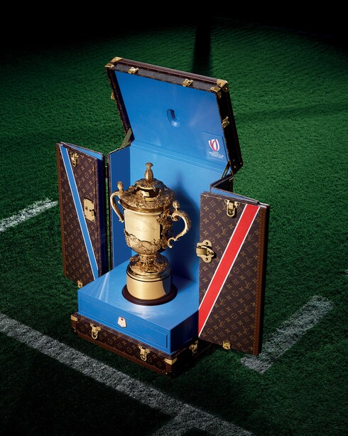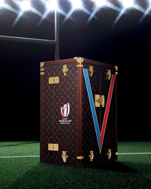 After an initial partnership in 2015, Louis Vuitton is once again the Official Trophy Trunk Supplier of Rugby World Cup France 2023 with a bespoke trunk for the coveted Webb Ellis Cup. Marking a new chapter in Louis Vuitton’s long-standing relationship with the Rugby World Cup, the hand-crafted trunk features the iconic Monogram canvas in the tournament’s colors, as well as the Roman numerals XV representing the number of players in a rugby union team and a Louis Vuitton leather lining in the same Pantone blue as the painted V detail, a first in the Maison’s history of trophy trunks.