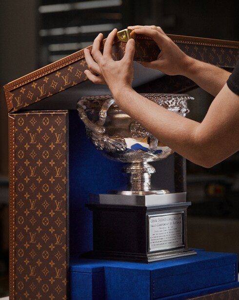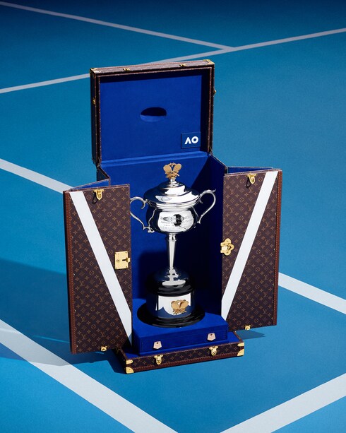 Honoring the Maison’s long-standing commitment to tennis, Louis Vuitton joined forces with the Australian Open 2024 for the first time, as the event’s Official Trophy Trunk partner, creating two bespoke Monogram trunks to protect the event’s Daphne Akhurst Memorial Cup (Women's) and Norman Brookes Challenge Cup (Men's). Displayed during the final tournaments and the prestigious prize-giving ceremonies, the two custom-made creations are lined in microfiber blue to match the competition's color codes, while a white AO logo features on the underside of the lid.