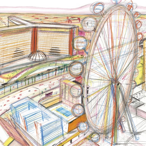 Yann Kebbi’s first experience of Las Vegas dates back to 2012, when he went on a “graphic road trip” from San Francisco to New York. In April 2022, Kebbi revisited Las Vegas for a week. He endeavored to test his mettle in the face of the city. He was immediately drawn in by the throngs of people streaming down the Strip with no clear purpose. As extremes collide within the perpetual movement, Las Vegas acts “like a play presented in the round with the actors in the middle and the audience hovering around them,” says the artist. The production work began upon Kebbi’s return to his studio in Paris: his pencil scratched, furrowed, and sculpted the paper.