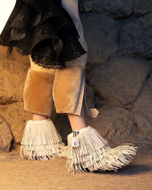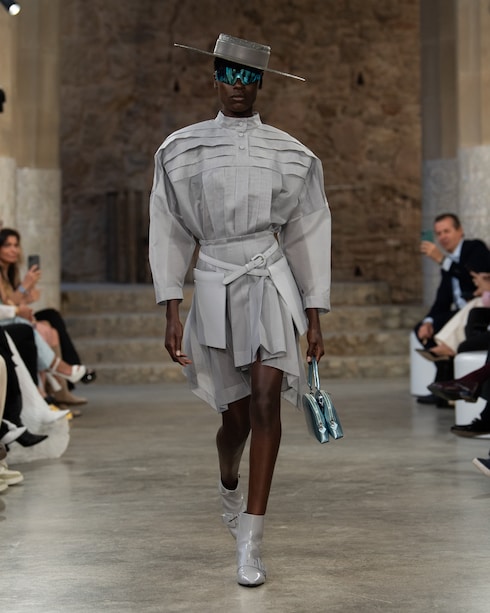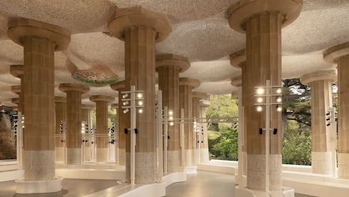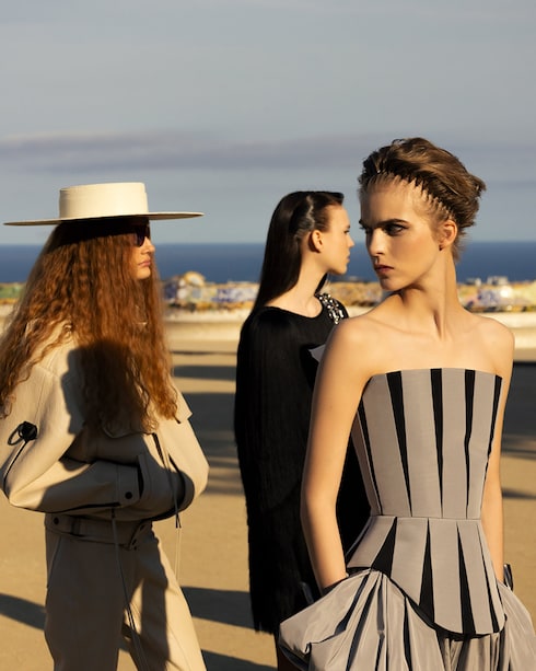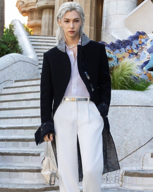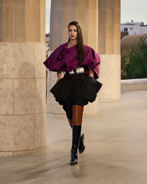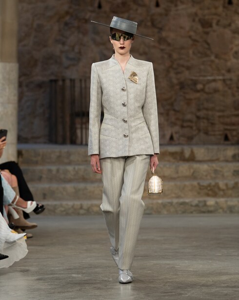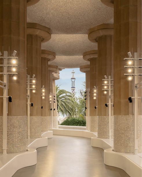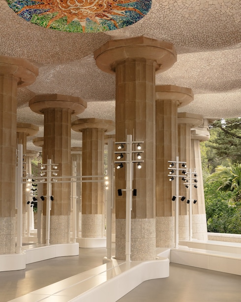Imagined by architect Antoni Gaudí, the avant-garde aesthetic that melds nature, stone, and mosaics echoes the visionary spirit of Louis Vuitton — creating a captivating backdrop enhanced by James Chinlund’s harmonious curved scenography.