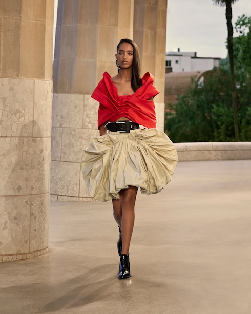 Showcasing architectural volumes and fluid draping, the collection intrigues through its elegant exploration of contrast. Punctuated with Spanish accents, the ready-to-wear creations, bags, and accessories are embellished with embroidery, fringes, and ruffles — etching new travel-inspired signatures.