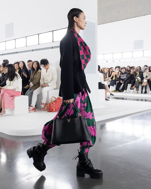 Celebrating the inspiring harmony between two singular realms, the collection propels a refreshed perspective to Louis Vuitton's heritage codes. Classic silhouettes are reinterpreted in a vibrant colorama, punctuated by embroidered signature emblems, along with a series of revisited bags and accessories.