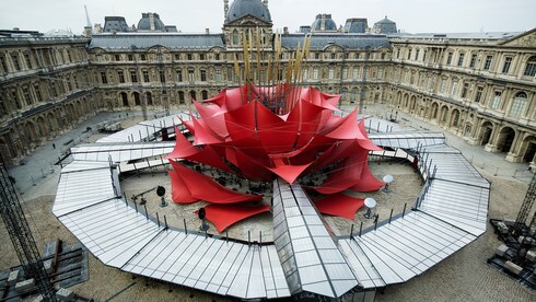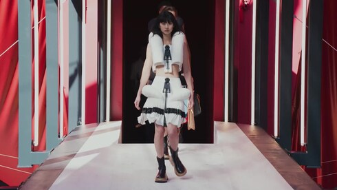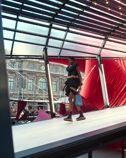 Staged once again in the majestic surroundings of the Louvre in Paris, Louis Vuitton’s Spring-Summer 2023 Collection is unveiled in the museum’s Cour Carrée. For the first time, Nicolas Ghesquière has invited leading French contemporary artist Philippe Parreno and production designer James Chinlund to conceptualize the event’s spectacular set design. With metal grills, mirrors, and a myriad of lightbulbs that evoke a fairground attraction, the set is centered upon a vividly red “monster flower” with golden stamen that rise up dramatically into the Parisian sky.