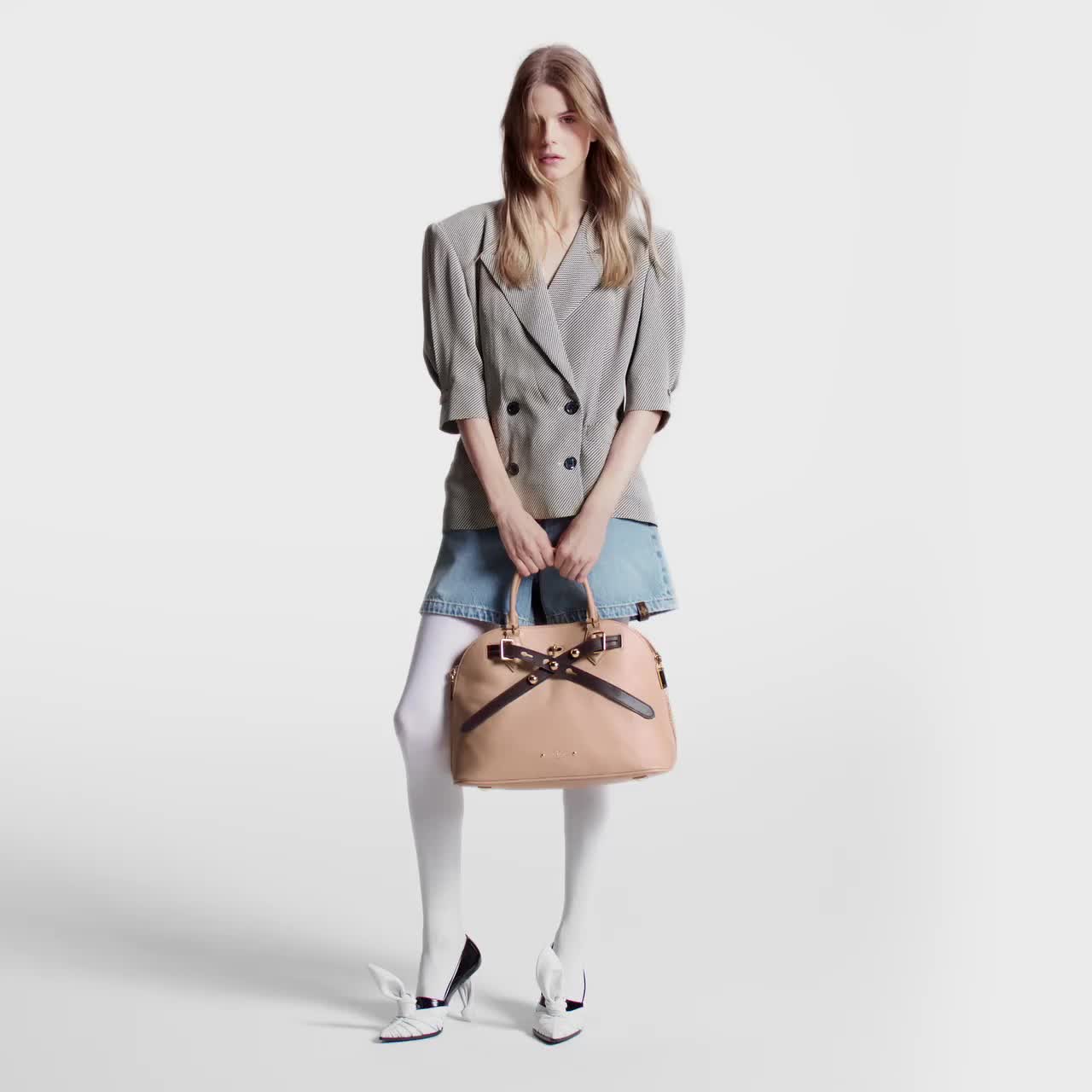 To celebrate the Alma’s 90th birthday, Creative Director Nicolas Ghesquiere created an ultra-supple version: the Alma 103 in calfskin. Unveiled at the Spring-Summer 2024 Show, it features a roomy interior and crafted details like the sliding leather belt closure, adorned with engraved LV rivets. It has two top handles for shoulder, elbow, or hand carry.