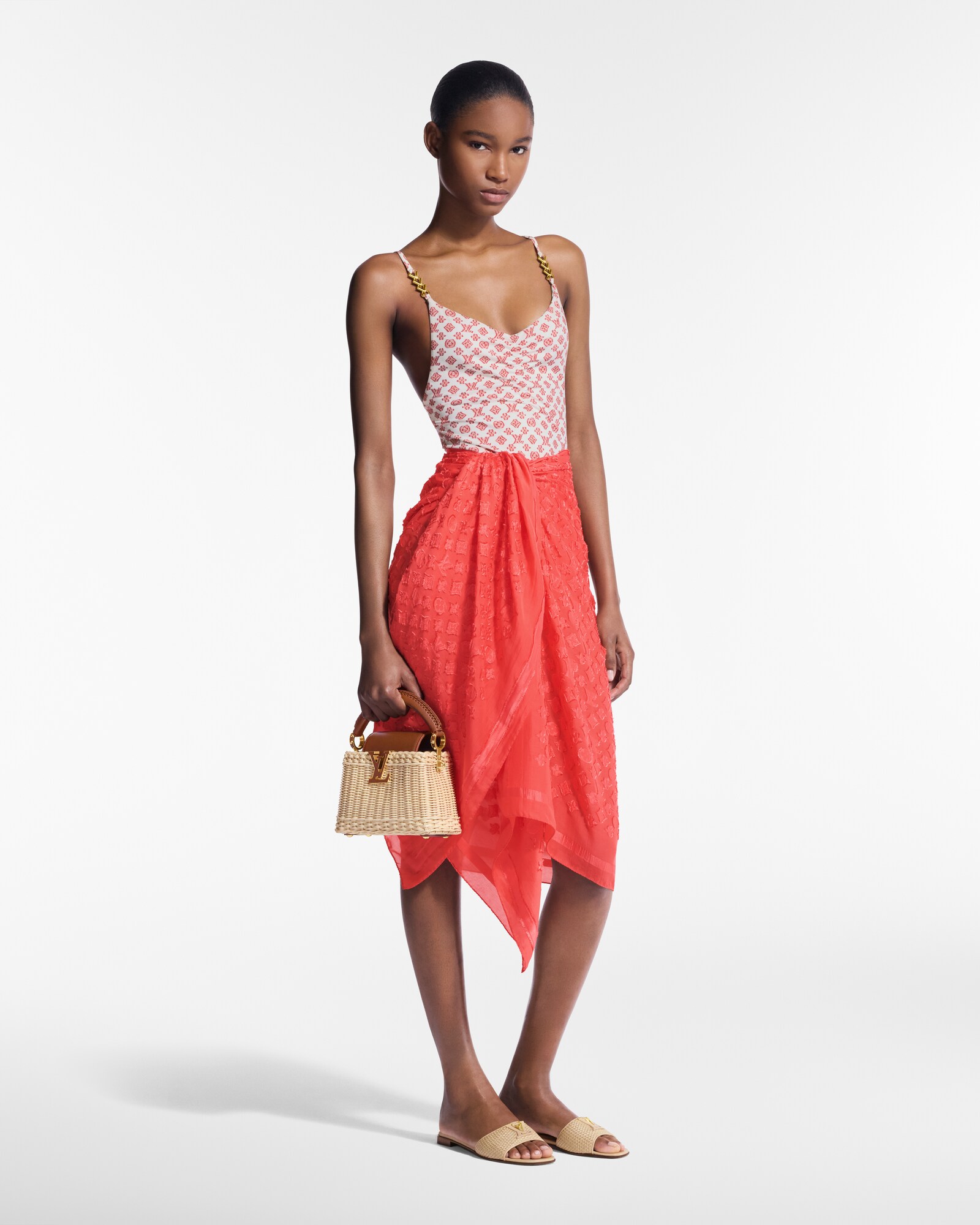 The Beach Pare All Sunset pareo offers plush, elegant protection from the summer sun. Crafted in a soft, fluid silk-cotton blend adorned with a refined variation of the Monogram motif, it features a sumptuous signature accent: a leather triangle emblazoned with the LV Initials. Versatile, with multiple styling options, it is the ideal companion for a summertime getaway.
