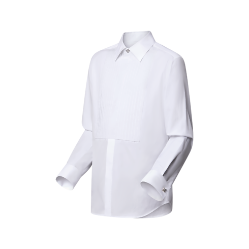 Impeccably chic, this white cotton poplin evening shirt is distinguished with a crisply pleated bib-front and metal LV cufflinks, while an LV collar button tops the concealed placket. This sophisticated piece can be worn under a formal waistcoat or paired with a tuxedo for a timeless evening look.