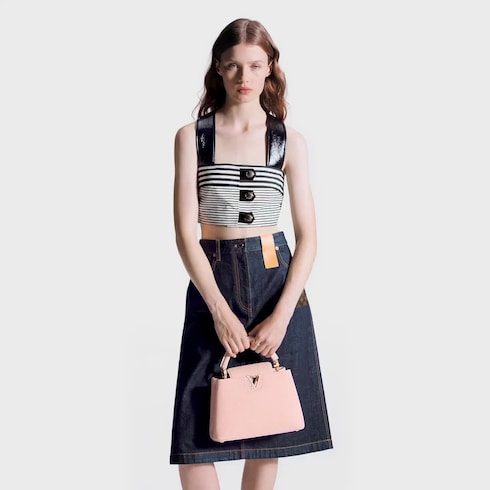 Fashioned from full-grained Taurillon leather, this Capucines BB handbag comes in an ultra-feminine colorway inspired by the flowers of the pink jasmine plant. It features a rolled-leather top handle and a wide removable strap for shoulder and cross-body carry. The versatile Capucines can be carried with the flap inside or outside.