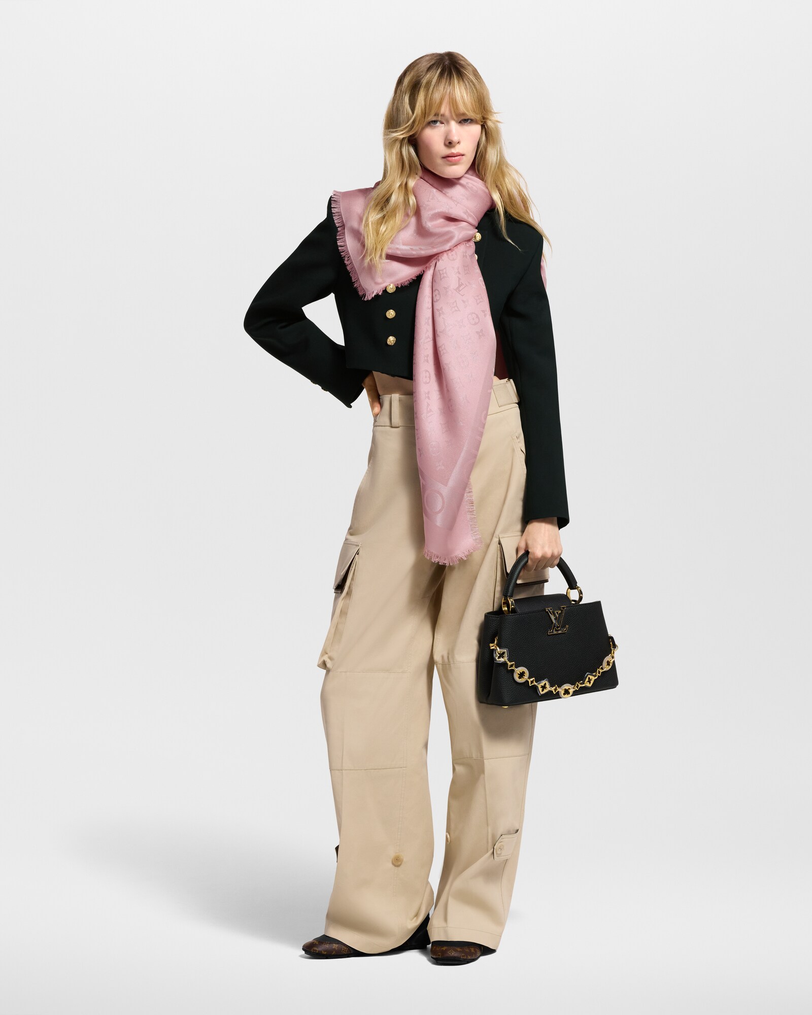 - Fits: two smartphones, earphones, LV Vertical Compact Wallet, keys