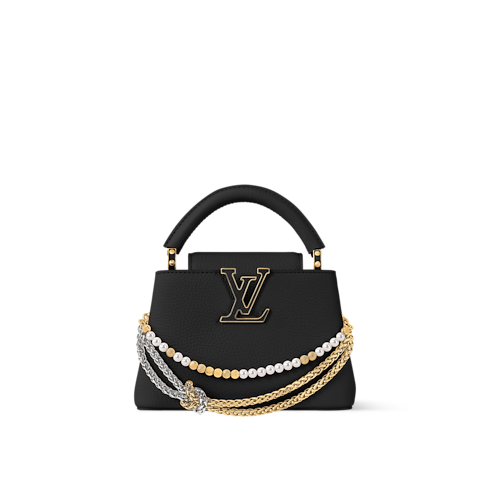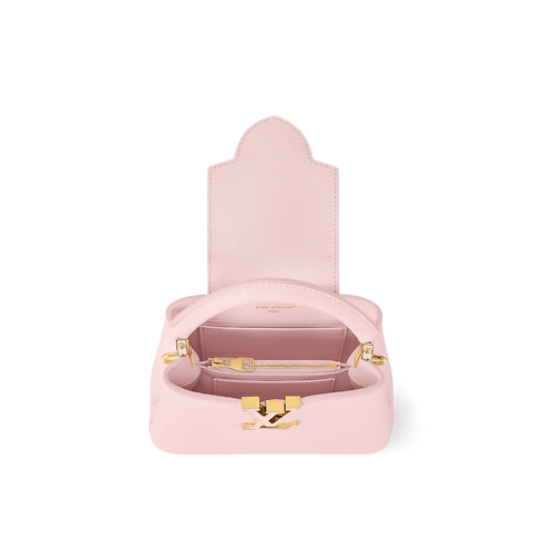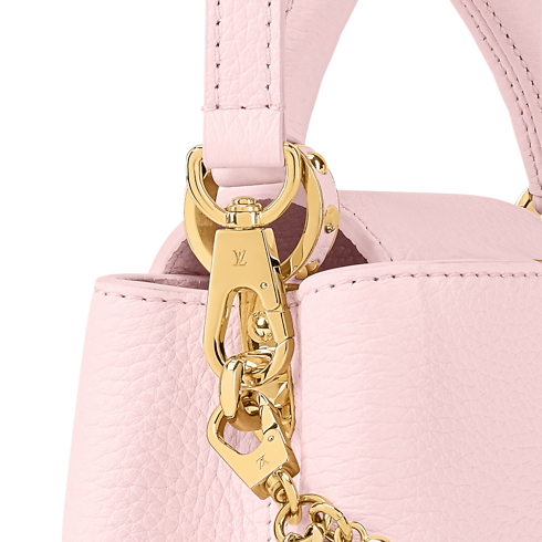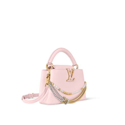 The Why Knot collection reinvents the Capucines Mini in a Sweet Pink colorway, adding a feminine touch to any accessories collection. It is crafted from refined Taurillon leather adorned with a bi-galvanized decorative chain that is inspired by jewelry – the elegant embellishment features signature Monogram hanging charms with exquisite pearl details. This edition also comes with a longer strap for versatile styling.