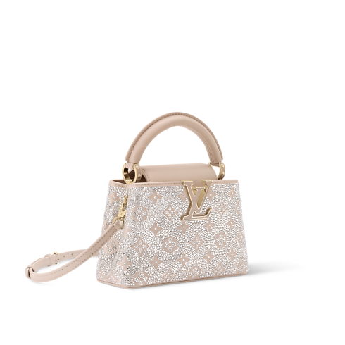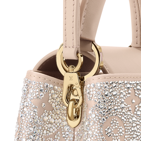 This shimmering edition of the Capucines Mini is a sophisticated choice for evening soirées. Part of the LV Mirage collection, it is crafted from satin and covered in light-catching Swarovski crystals. The Desert Sand colorway matches the tonal LV Initials, which are framed with elegant gold-toned hardware. It can be carried by hand, styled cross-body, or worn over one shoulder.