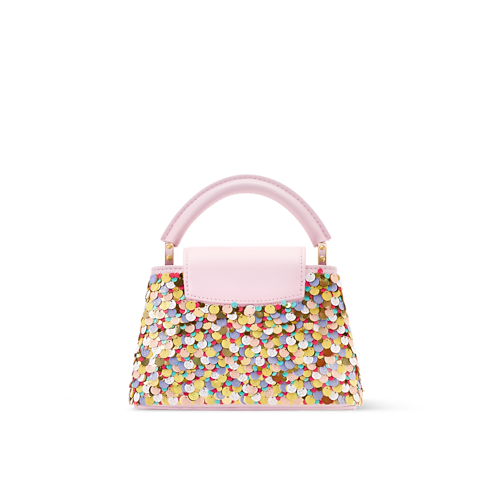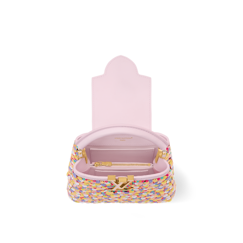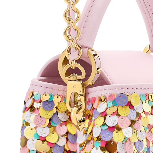 Feminine and unique, this Pink Capucines Mini is from the Exceptionals collection. Embroidered with multicolored sequins, it is crafted from calfskin and features tonal LV Initials that are framed with golden hardware to match the braided chain. Inside, it is fitted with a flat pocket and has enough space to store daily essentials, including a favorite lipstick.
