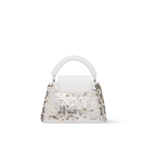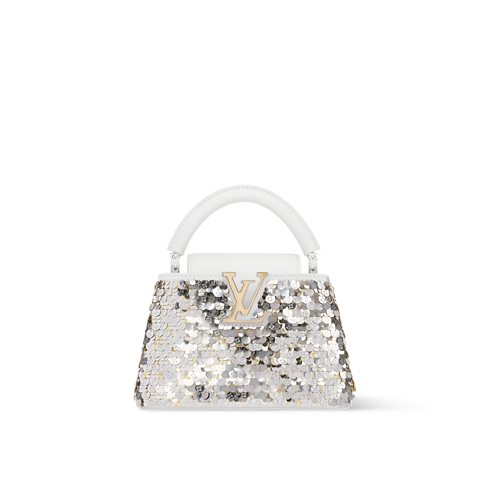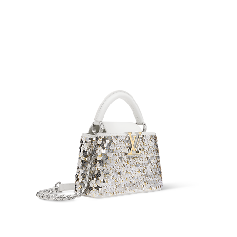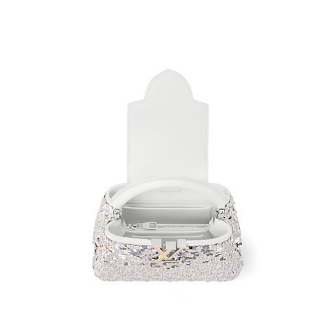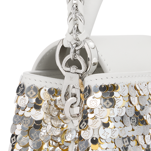 Reimagined in an elegant Snow colorway, this Capucines Mini belongs to the Exceptionals collection. It is crafted from calfskin embroidered with shimmering sequins and features gold and silver toned LV Initials to match the braided chain. Inside, it is fitted with a flat pocket and has enough space to store daily essentials, including a favorite lipstick.
