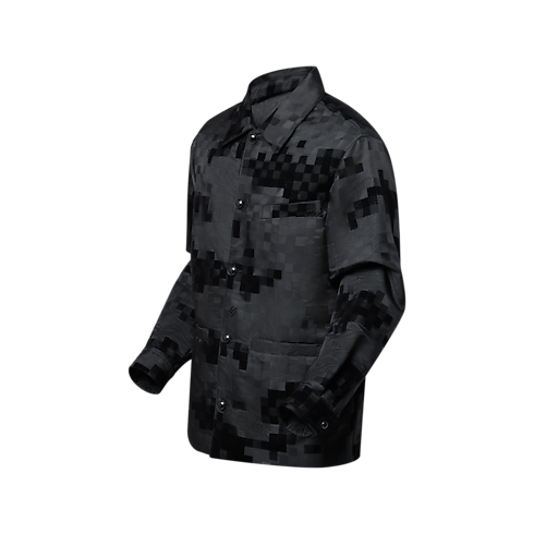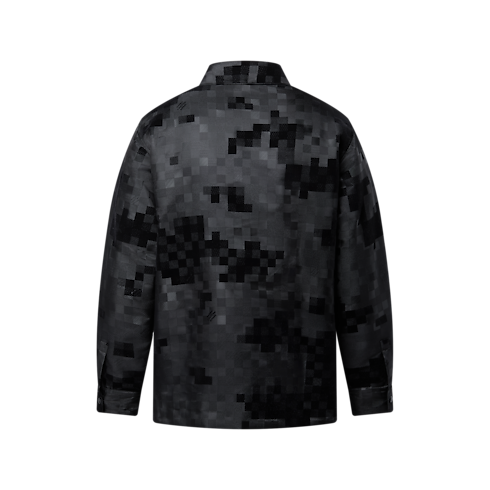This chic black Damoflage overshirt is a perfect layering option for spring days. The emblematic motif from the Spring-Summer 2025 show is richly executed in a textured jacquard with velvety flock accents and scattered Marque L.Vuitton Déposée signatures. This fully lined piece is finished with black pearl-effect buttons, bringing a sophisticated accent to everyday looks.