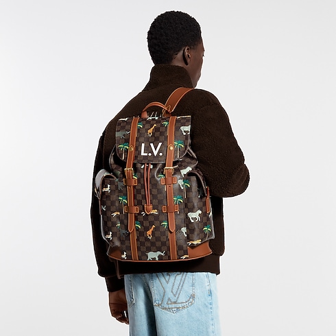 The rugged Christopher MM backpack is crafted from Damier Heritage coated canvas, customized with a print of wild beasts charging through palm trees as part of The Darjeeling Limited collection. The darker colorway is accented with brown leather trim. Bold white L.V. initials on the flap echo the film’s Louis Vuitton luggage.
