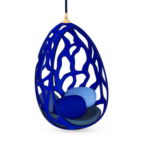 This plush hanging chair is a one-of-a-kind interpretation by Fernando and Humberto Campana of their Cocoon for the Louis Vuitton Objets Nomades collection. Its delicate openwork fibreglass shell is lined with ultra-soft fur, enhanced by fluffy sheepskin cushions that embrace the shape of the seat. Comfortable and comforting, it offers an inviting, soothing place to relax.