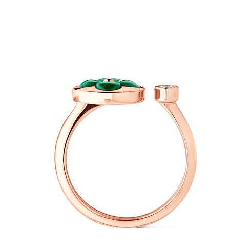 The Color Blossom pieces celebrate the emblematic Monogram Flower, designed in 1896 by Georges-Louis Vuitton, son of the founder. Set into 18-karat pink gold, this precious ring features a Sun motif carved from green malachite, hand-polished to a high gloss and accented by a brilliant round diamond. Months of work were necessary to perfect the stone’s subtle curves and sparkle. This delicate ring is an invitation to stack, mix or match with other models from the collection.