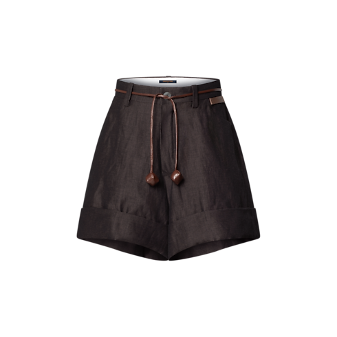 These tailored shorts have an air of elevated ease in a richly hued wool-linen blend. They are cut in a comfortable high-rise straight shape with chunky oversized cuffs anchoring the silhouette. A slim leather cord belt trimmed with playful LV Cubes underscores the casual appeal, while this season’s chic Louis Vuitton Paris patch discreetly signs the hip.