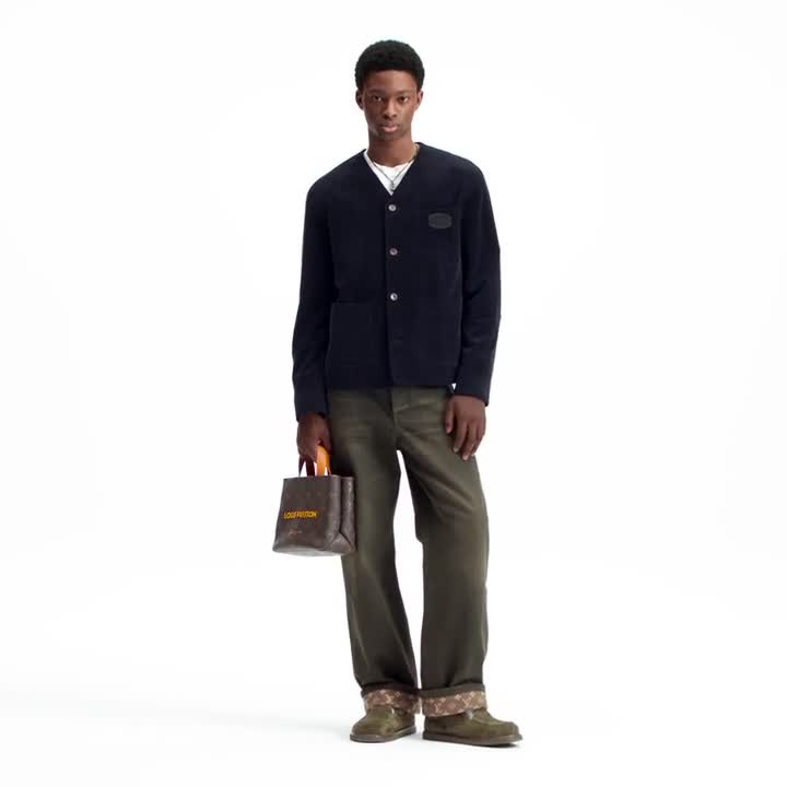 This elegant jacket tailored from midnight blue corduroy is inspired by the British countryside. It has a softly structured, workwear-influenced style with patch pockets and a collarless V-neck. Black leather signature patches, crafted with a mix of House signatures, accent the breast pocket, back and elbows. This refined piece lends subtle color and velvety texture to smart everyday looks.