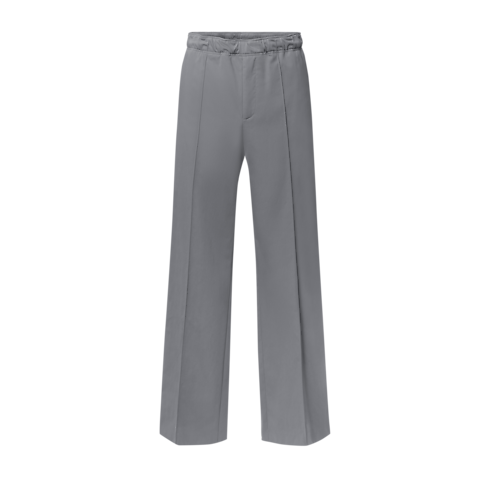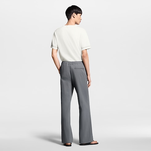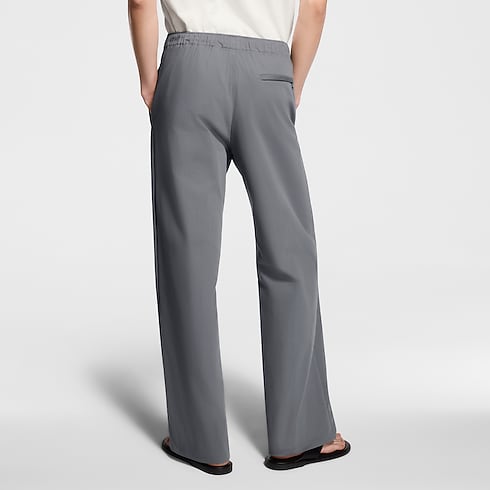 Crafted in a light cotton-blend satin crepe, these pale gray drawstring pants blend formal and casual styles for an effortlessly elegant look. The draped silhouette combines a comfortable elasticated waistband with a creased front, while sporty silicone-printed Louis Vuitton lettering adds a contemporary detail to the left leg. Perfect for spring, they provide a refined counterpart to this collection’s floral motifs.