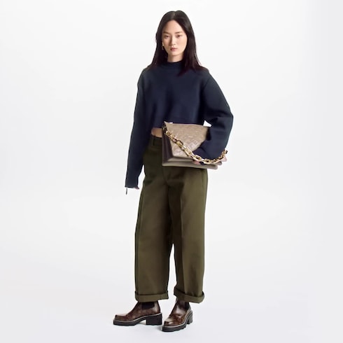 The most eye-catching bag of the Fall-Winter 2021 collection, the Coussin MM handbag is fashioned from puffy lambskin, embossed with a Monogram pattern. Voluminous, soft and supple, the bag almost feels like a pillow. An adjustable textile strap allows for shoulder and cross-body carry, while the new Edge Chain invites fashionable under-the-arm styling.
