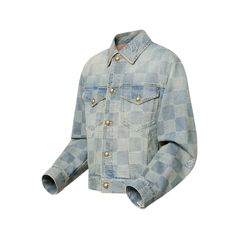 The classic silhouette of this denim jacket is distinguished with a 3D Damier jacquard incorporating Marque L.Vuitton Déposée signatures with a softly textured effect. Crafted in washed indigo denim, it has yellow topstitching with aged copper-toned components and domed buttons. A wardrobe essential that is easy to mix and match, it has matching jeans for a signature look.