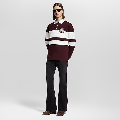 A chic take on a casual silhouette, this long-sleeved polo shirt is crafted from organic cotton in rich burgundy tones with contrasting white Damier piqué bands and a cotton poplin shirt collar. An embroidered signature patch resembling a university crest embellishes the chest, while golden embroidered Monogram Flower details adorn the bottom right hem.