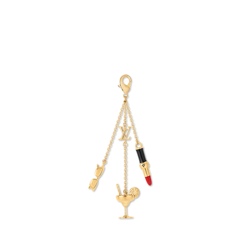 Specially created for the LV Charms collection, this trio of dangling charms evokes the world of feminine elegance with a playful contemporary touch. Suspended on fine-linked gold-toned chains, they depict a pair of chic sunglasses, a fancy cocktail and a brightly colored lipstick tube. Perfect for adding an eye-catching accent to a handbag or any other accessory.