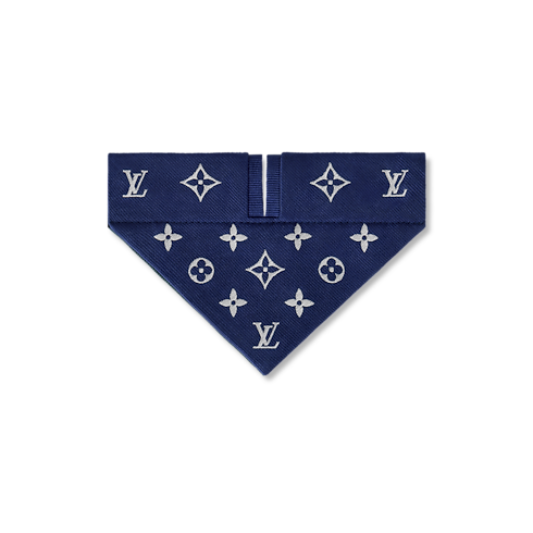 The first textile designed by Louis Vuitton for dogs, the Dog Bandana PM is inspired by the easy panache of men's ties. Green on one side, and navy on the other with the Monogram pattern in cream, the reversible silk bandana easily accessorizes the dog collar and is a perfect companion to the dog leash.