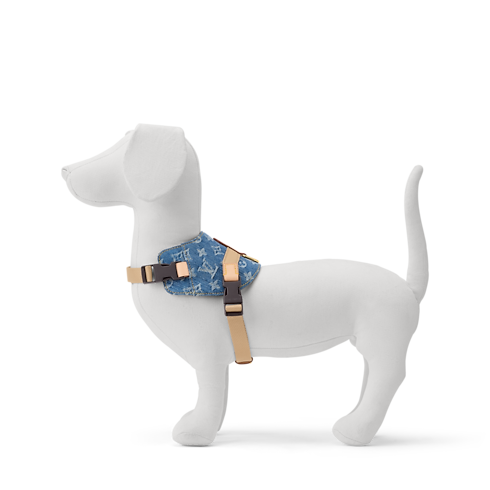 Joining the fashion-forward styles of the pets collection is the dog harness PM, showcasing the contemporary-feeling Denim Monogram motif. Additionally, nylon webbing and natural cowhide leather work in tandem to maximize comfort and security, while an elegant gold-toned hook links onto an accompanying leash. This size fits mini and small-sized dogs.
