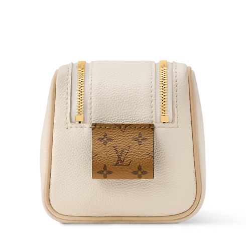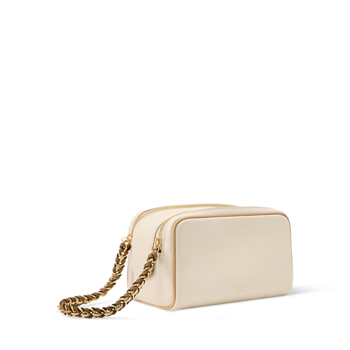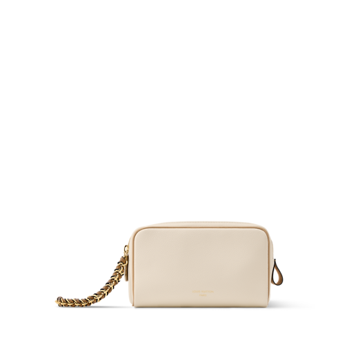 Creative Director Nicolas Ghesquière infuses feminine elegance into the Mini Dopp Kit, crafted from vanilla-toned calfskin and finished with a golden braided chain. A double-zip wide opening offers easy access to the Monogram-lined interior and its zipped pocket, while the chain transforms this functional piece into a chic hand-carry option.
