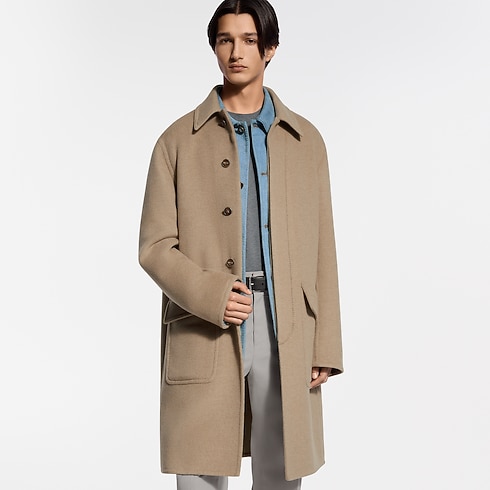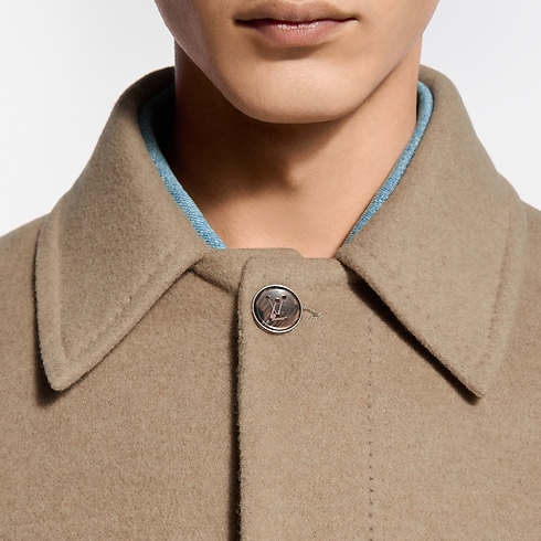 This timeless caramel colored car coat is crafted from brushed cashmere double-face fabric for unparalleled softness and warmth. The unlined silhouette makes a fluid, effortlessly elegant outer layer. It is signed with LV stitching on the top button and a VVN leather tab on the back of the collar, while pick stitching adds a sartorial finishing touch.