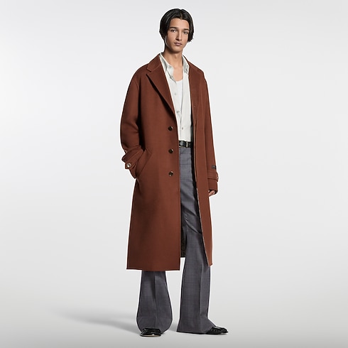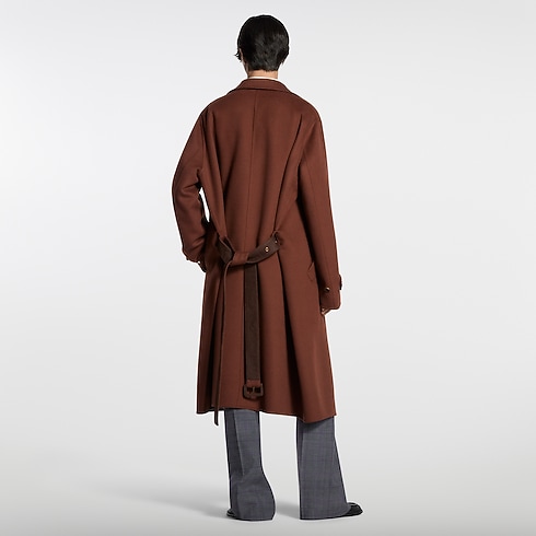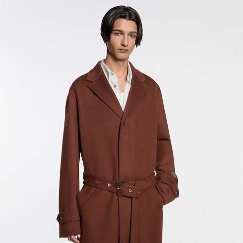 This belted wool-silk coat from the Spring-Summer 2026 show embodies the insouciant elegance of this collection’s Indian Dandy. The fluid silhouette is crafted from double-face fabric with a graphic jacquard LV Maze motif inside, inspired by Indian billboards. A brown leather patch with embossed Louis Vuitton Paris lettering adds a chic finishing touch to the left sleeve.