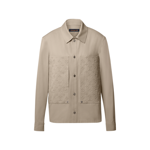 This workwear overshirt embodies this collection’s laid-back yet elegant mood. Crafted in soft beige cotton twill, it is adorned with two Monogram-embossed panels on the front lending a refined textural accent, while Monogram Flower rivets and pearly buttons add further distinction. A black leather patch signs the back. Matching pants make an effortlessly chic look.