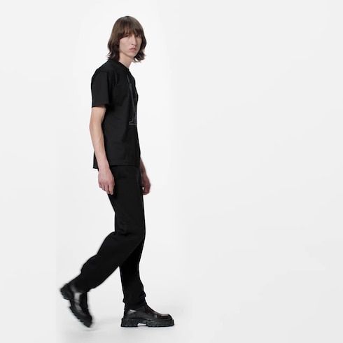 These sporty pants are made from brushed back cotton felpa and come in one of this season’s iconic colors, set off by a contrasting white cotton cord at the waist. The Louis Vuitton signature is embroidered in white above the front left pocket and underlined with a matching white staple pin.
