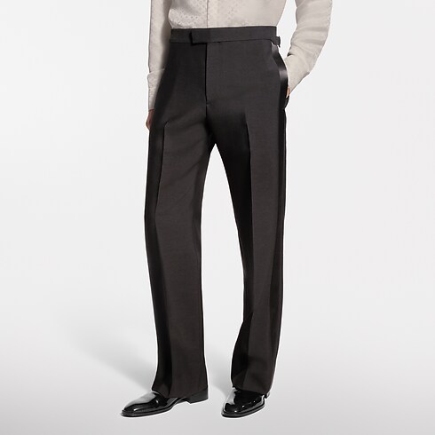 These black tuxedo pants are impeccably elegant, tailored from draped wool-silk crepe with satin bands down the outside of each leg. An adjustable waistband ensures a sleek silhouette with Monogram Flower rivets adding discreet signatures to the tabs. A matching tuxedo jacket and shirt make a chic evening set.