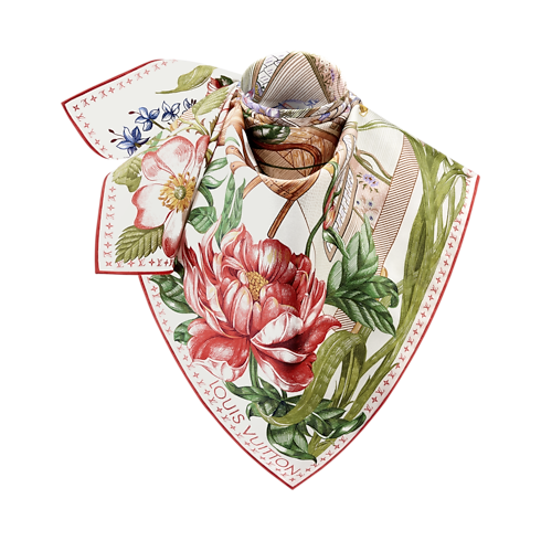 The all-silk Fontaines Parfumées square captures the essence of Louis Vuitton in an intricate design inspired by the art of fragrance. Its colorful pattern depicts a vintage-style perfume extractor surrounded by delicate flowers, with the House’s perfumery atelier in the background. An elegant, feminine accessory, infused with the harmony of craftsmanship and nature.