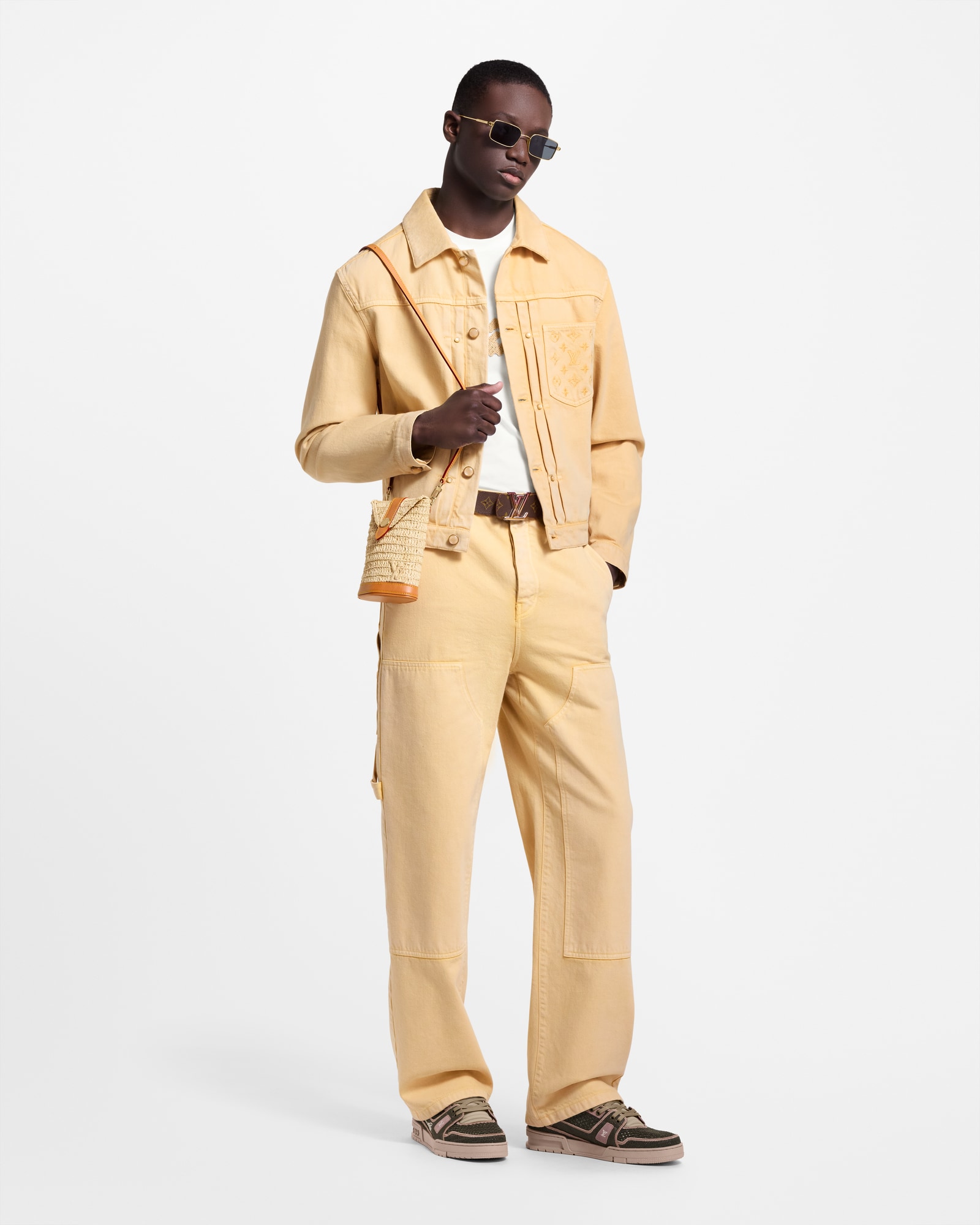 This Type II denim jacket with a classic pleated front is garment-dyed in sunny pale yellow tones for a washed vintage effect. Monogram embroidery adorns the chest pocket, while pearly tonal buttons and rivets lend a sophisticated finishing touch. Matching carpenter pants make a summery workwear-inspired set.