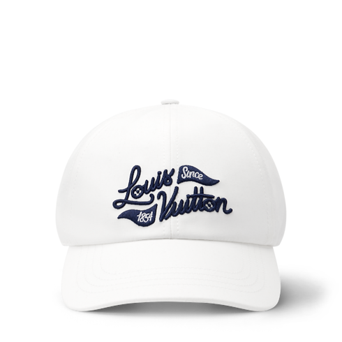 The bright white golf cap freshens up a day on the green. The signature, "Louis Vuitton Since 1854", is embroidered in an elegant script alongside triangle golf flags on the front panel in an intense blue. The back strap is equipped with a square buckle engraved with LOUIS VUITTON for customizable comfort and elegance.