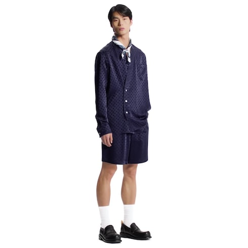 This fluid long-sleeved shirt draws on the Fall-Winter 2025 collaboration between Pharrell and Nigo with a contemporary kimono-style fastening recalling the latter’s Japanese origins. It is crafted from a silky deep navy blue jacquard featuring a tone-on-tone Dandy Monogram motif and adorned with delicate mother-of-pearl effect buttons. A Marque L.Vuitton Déposée patch signs the back of this elegant day-to-evening style.
