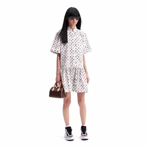 This shirt dress has a bold, summery spirit in cotton poplin featuring a graphic allover print of this season’s Pop Art-inspired Monogram motif. The top half has a classic tailored look with short sleeves, a smart collar and a button front, while the skirt is gathered around the hips to add breezy volume to the silhouette.