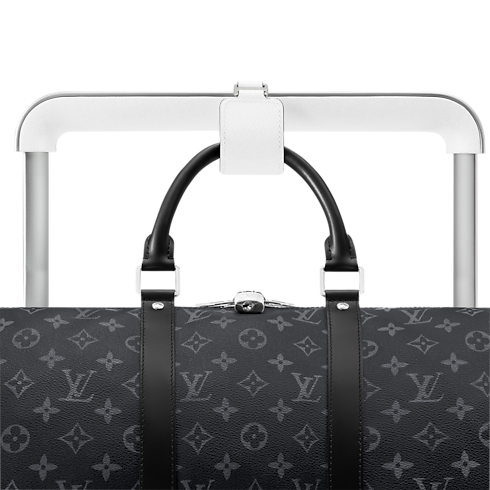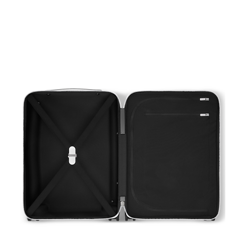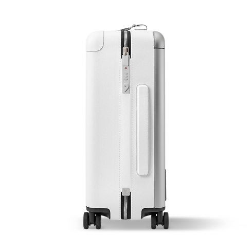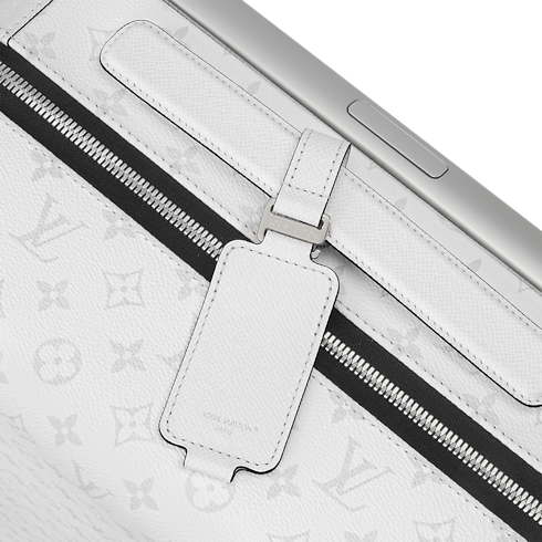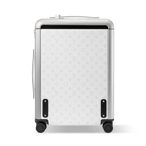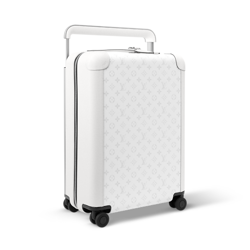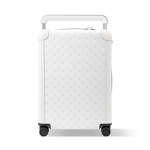 The Horizon 55 rolling suitcase combines white Monogram coated canvas with Taiga cowhide leather for a refined monochromatic look. Its exterior cane design maximizes space, revealing an interior with elastic straps and a zipped divider. Four compact wheels and a wide cane handle make this cabin-sized piece effortlessly easy to maneuver.