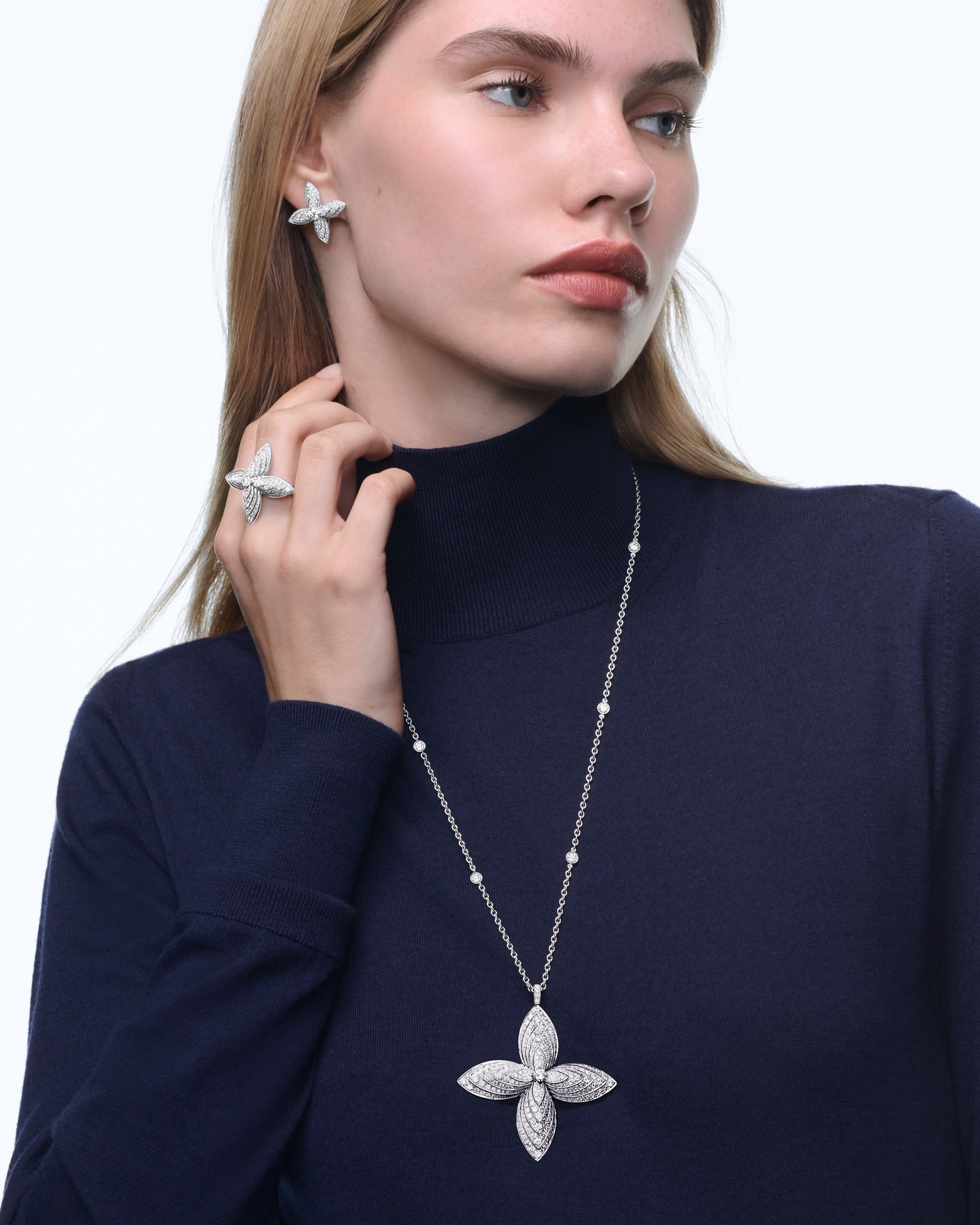 The exceptional jewels of the Idylle Blossom collection reinterpret the emblematic Monogram Flower, giving this historic Louis Vuitton signature an elegant contemporary twist. Combining the warm allure of 18-karat white gold with the captivating gleam of meticulously set diamonds, this sumptuous pendant is a testament to exquisite craftsmanship. Overlapping layers of petals, each delicately hand-finished, surround a beautiful central diamond, creating powerful volumes with a delicate illusion of movement. This mesmerizing jewel makes a bold statement, elevating any look. Whether worn alone as a signature piece or in combination with other Idylle Blossom creations, it is a symbol of refined taste and lasting elegance.