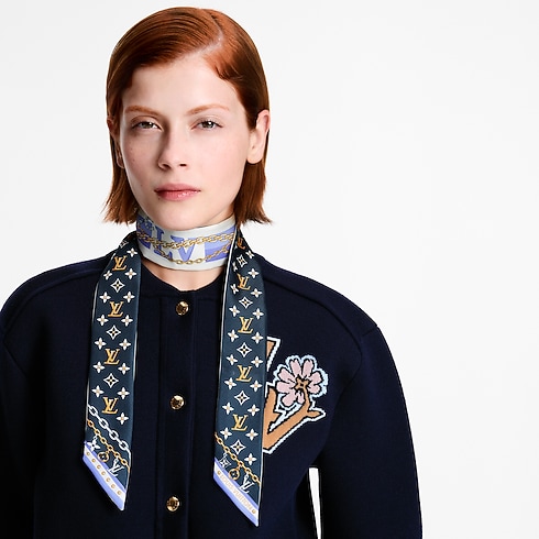 The elegant K Charms bandeau captures the spirit of Louis Vuitton in an enchanting, ultra-feminine design. Printed on pure silk, its pattern features a chain holding an array of symbolic charms evoking the Monogram signature and the House’s travel heritage. Ideal for everyday wear, this sophisticated bandeau adds a subtle touch of chic to any outfit.