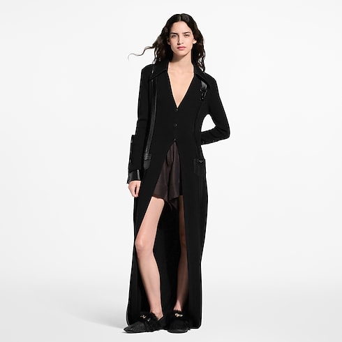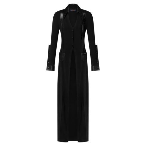 This cardigan from the runway is crafted in a full-length, fitted shape from a ribbed wool knit. Lambskin leather highlights the buttons, pointed collar, patch pockets, cuffs and graphic trims that run the length of the silhouette. A swivel snap hook adds a utility detail to the chest, while a Louis Vuitton Paris patch signs the hip.