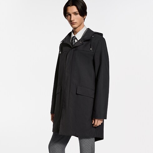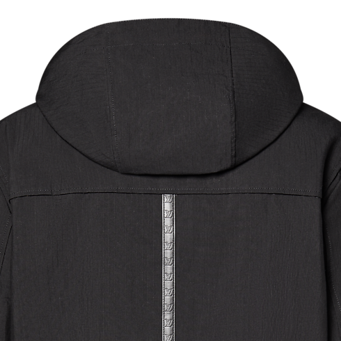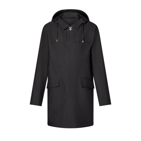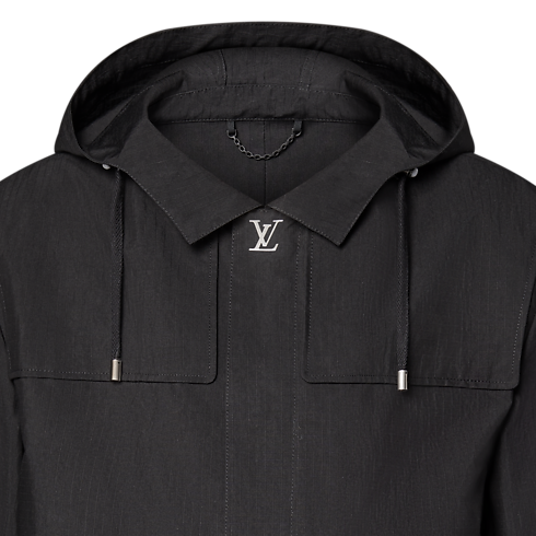 This water-repellent black hooded parka is an elegant and functional light outer layer crafted from technical cotton ripstop. Sophisticated details elevate the minimalist silhouette, with an LV snap button at the top of the zipper placket, Monogram Flower eyelets and rivets and leather LV Lozine embossed tape on the back in homage to the House’s travel heritage. A versatile piece for business or weekend looks.