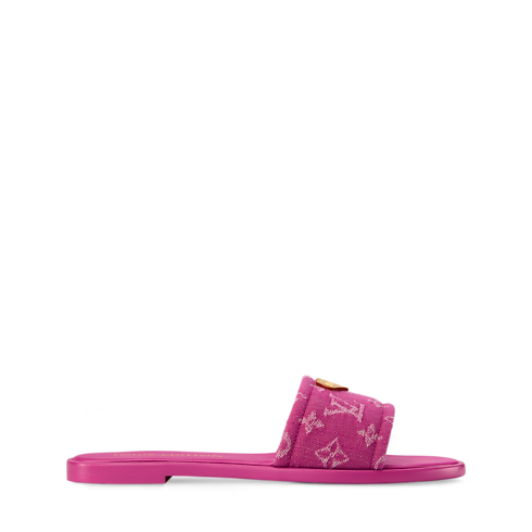 The Lily flat mule is a casual-chic style in the House's emblematic Monogram denim. It is distinguished by its wide front strap, which is signed with a natural leather label and a gold-toned stud, referencing the leather goods collection. The supple rubber outsole is color-matched to the upper for a refined look.