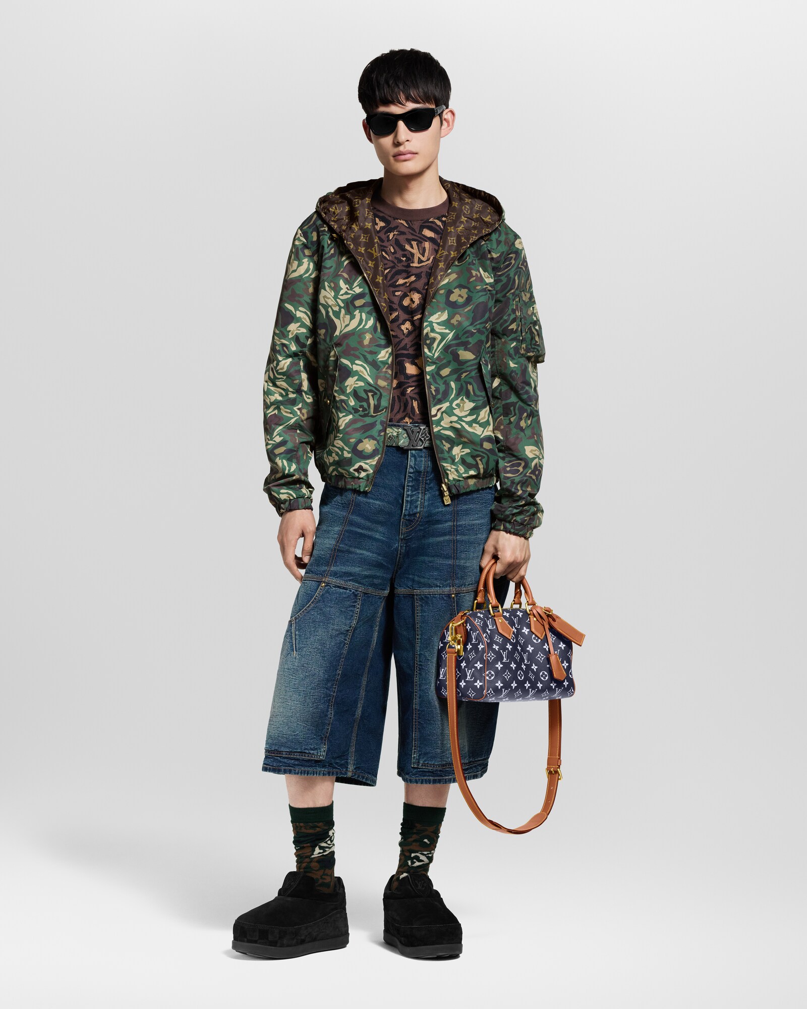 The cotton-blend LV Camo socks unite a selection of browns, creams, blacks, and greens to harmonious effect. Here, Pharrell Williams and Nigo have creatively distorted the motif's original shapes and Monogram Flowers to a vivid and enthralling end, topping them off with a woven label bearing an LV and the collaborator's portraits.